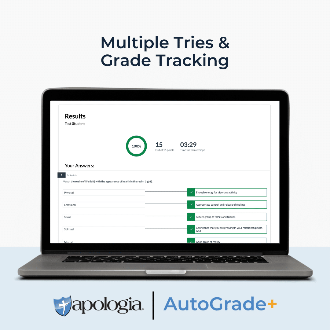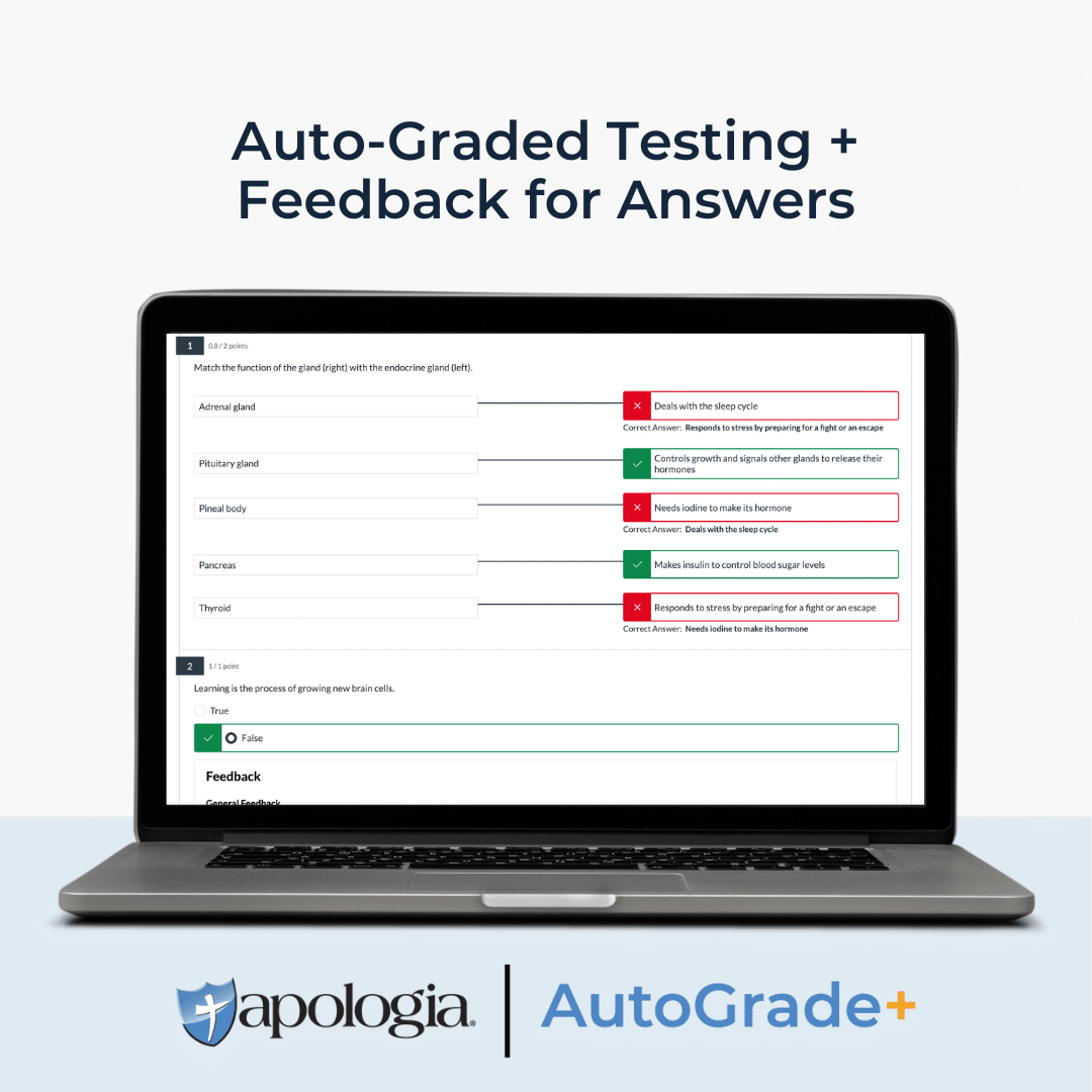 Apologia’s AutoGrade+ is a curriculum add-on that provides dynamic online testing for Apologia courses with multiple attempts, immediate answer feedback, and automatic grade recording.