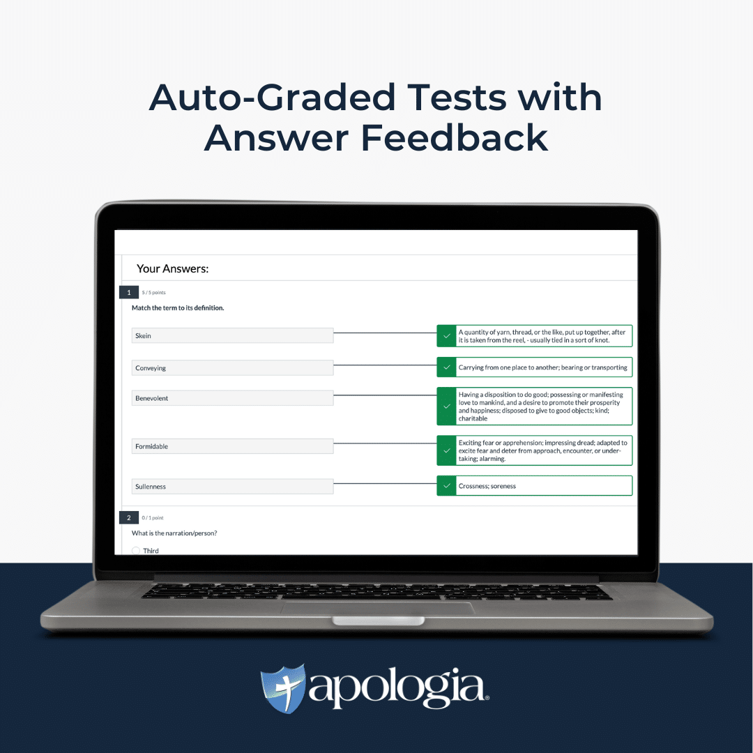 The tests in our Self-Paced Literature Unit Studies are designed with automatic grading. After completing a test, students will receive an immediate grade.